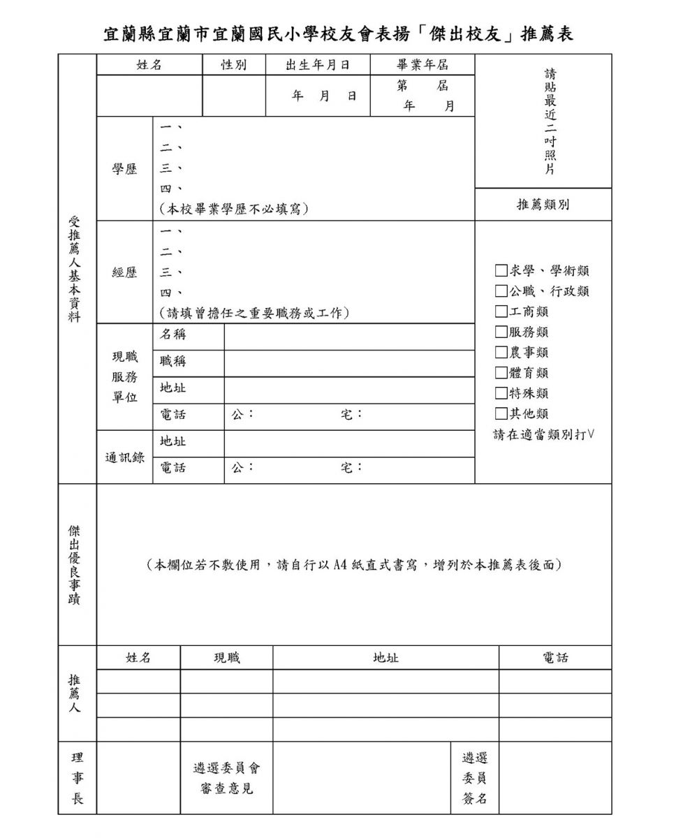 > 下載 宜蘭縣宜蘭市宜蘭國民小學校友會表揚「傑出校友」推薦表
