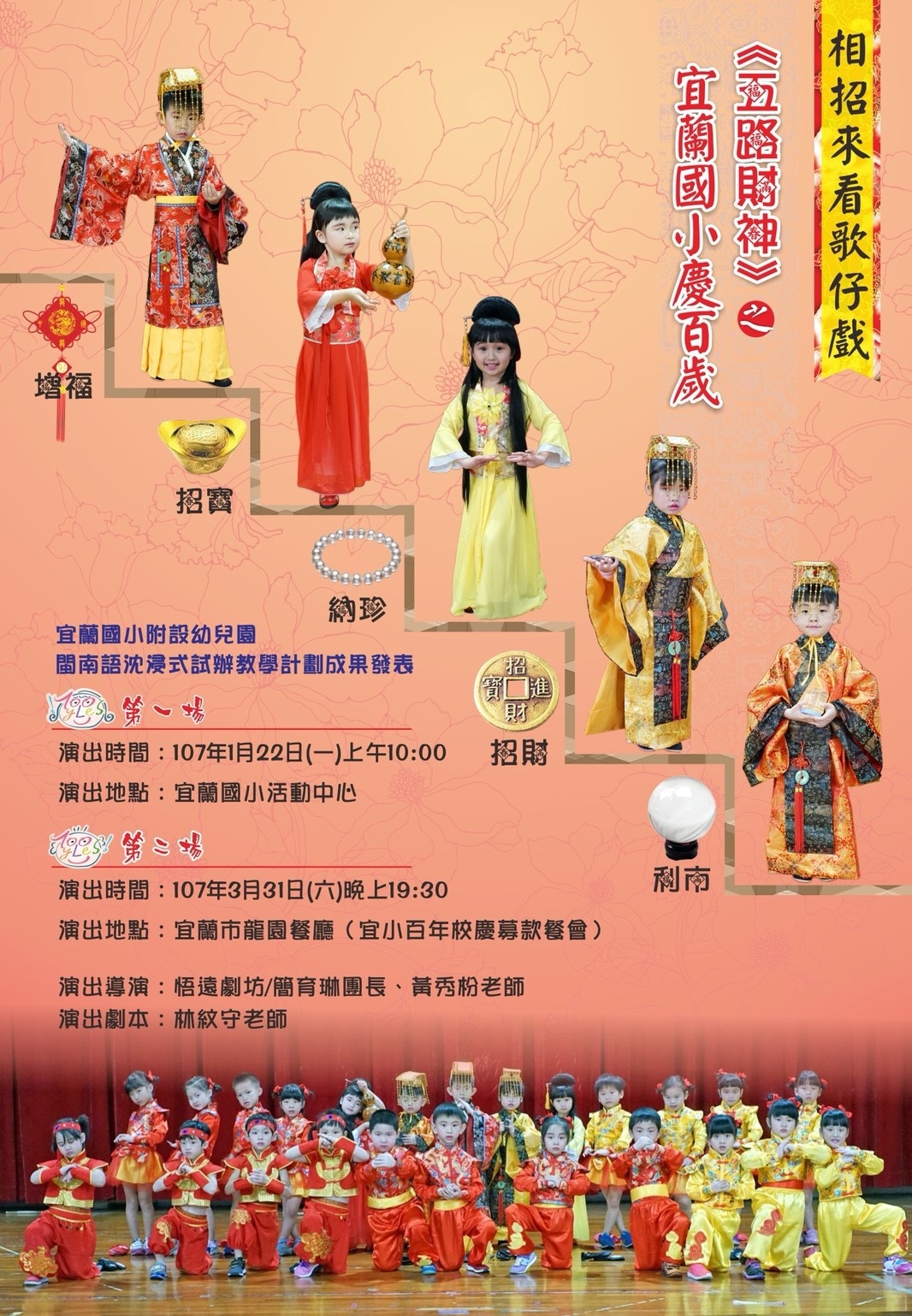 宜蘭國小一百歲了,宜小遮的囝仔兄、囝仔姊,歡喜來躬逢其盛!幼兒園,在悟遠劇坊的簡育琳團長指導下,合作完成一齣歌仔戲的演出,小演員都是學齡前3-5歲的孩子。